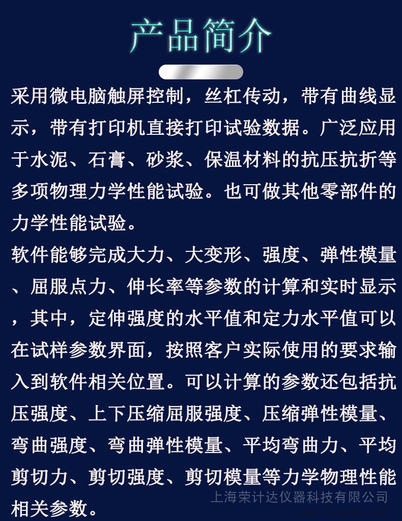 采用微电脑触屏控制,丝杠传动,带有曲线显示,带有打印机直接打印试验数据。广泛应用于水泥、石膏、砂浆、保温材料的抗压抗折等多项物理力学性能试验。也可做其他零部件的力学性能试验。