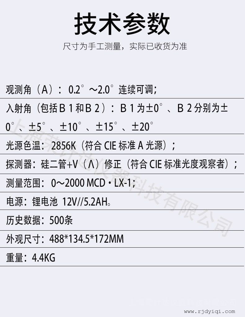 ★该仪器设计的主要技术依据为我国标准 GB/T 3978-2008《标准照明体和几何条件》 ,GB/T 3979-2008《物体色的测量方法》和 GB/T 24725-2009《突起路标》以及 JJG 059-2004《逆反射测量仪检定规程》。还参照了其他有关标准(如 ASTM-810,ASTME809,DIN 67520) .该仪器的探测器符合 CIE(国际照明委员会)标准光度观察者的要求,光源色温符合 CIE 标准光源,仪器几何条件符合 CIE 技术文件第 54 号的规定。故该仪器的技术条件与国际上相一致。 主要技术指标: